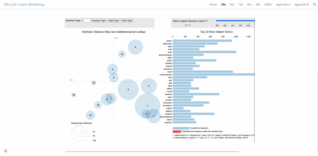 LDA Topic Modeling liste des “mots-clés” issus des travaux de Paul Ricœur, les regroupe par thèmes et schématise leur fréquence d’utilisation par tranches de 10 années, depuis les années 1950 jusqu’aux années 2000.