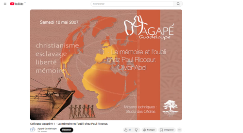 Communication d’Olivier Abel sur “La mémoire et l’oubli chez Paul Ricœur”, donnée lors du 11e colloque Agapé, sur la chaîne Youtube de l’association Agapé Guadeloupe (2007)